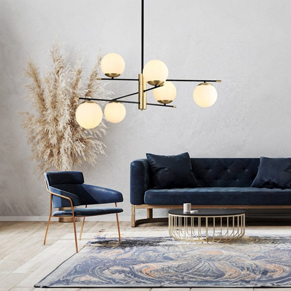 Colour: Black/Satin Gold with Opal Glass Lamp: 6 x E14 (not included) Wattage: 230v 40W IP Rating: IP20 Measurement in cm: Full Height: 74 Shade Diameter: 78 Glass Diameter: 15