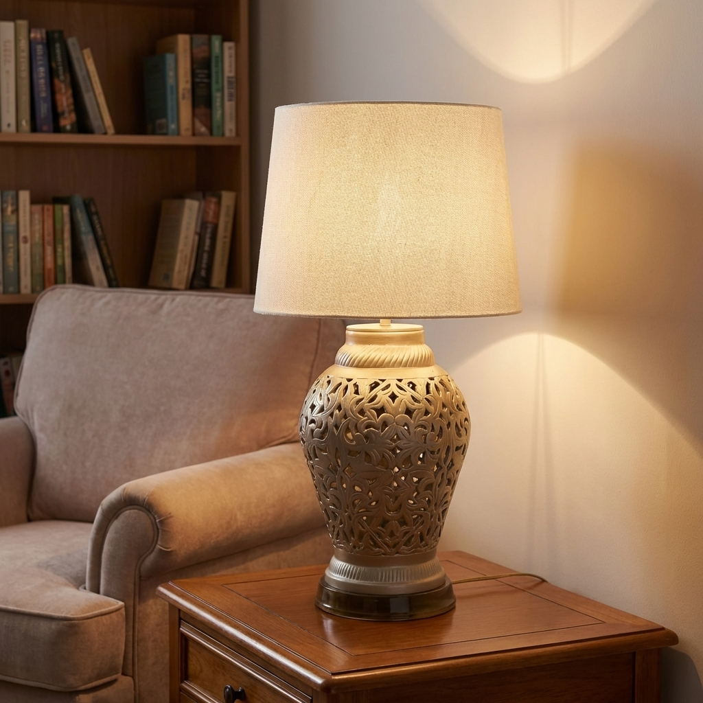 – Includes cord (1.4m) with on/off switch on the cord and plug – Not included BC lamp – IP rating: IP20 – Colour: Gold – Dimensions: 57cm height x 17cm width – Weight: 3000g – Base: 24cm – Material: Pewter metal